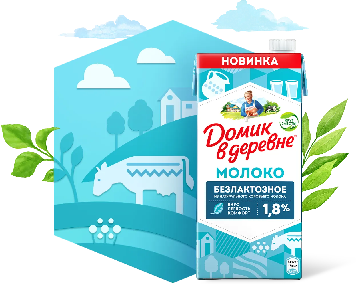 Безлактозное молоко «Домик в деревне» 1,8% производится из натурального молока, обладает нежным сладковатым вкусом, но не содержит молочного сахара.